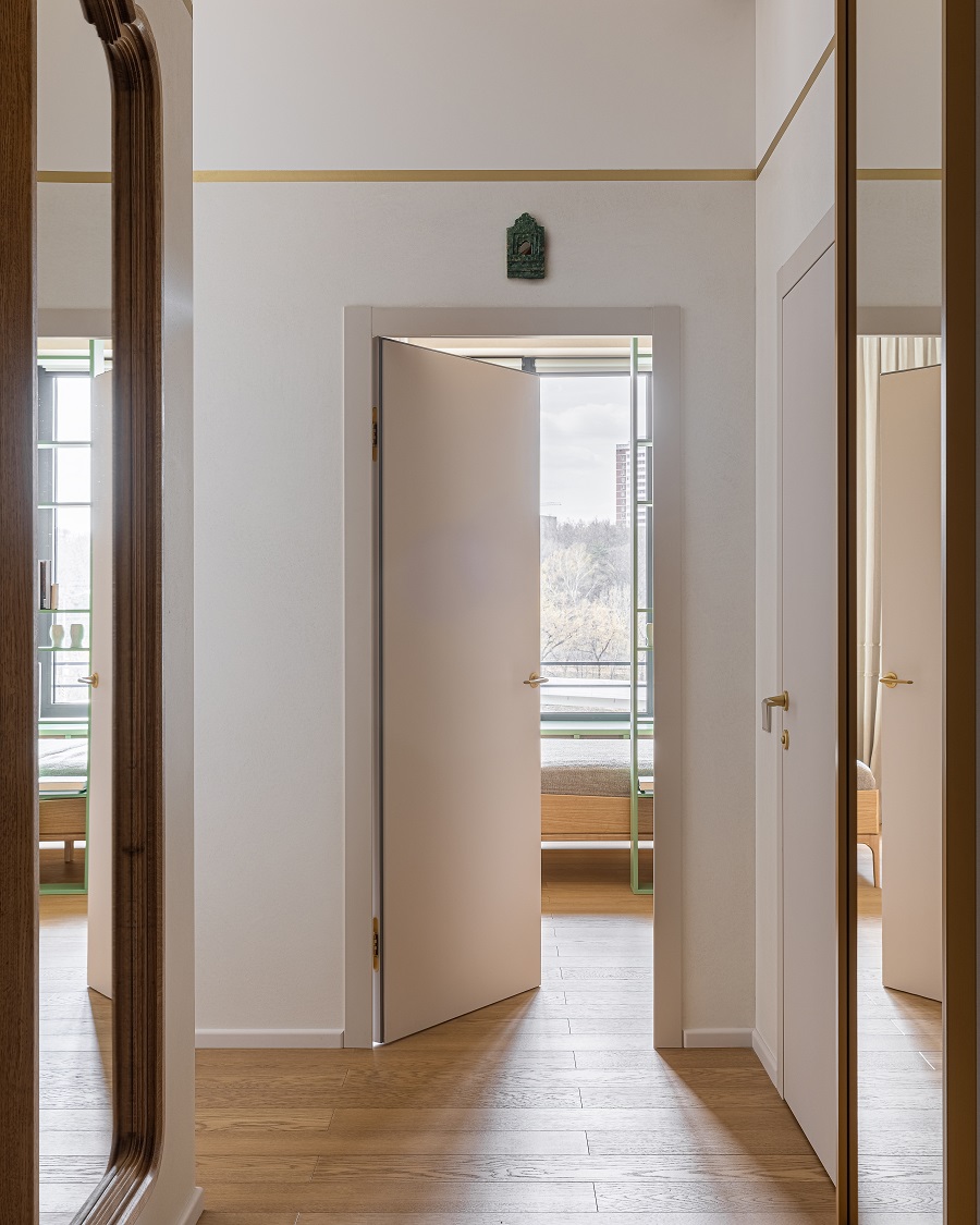 Передо дизайнером Анной Исуповой встала задача найти компромисс между архитектурой современного ЖК, ритмами большого города и привычкой заказчиков жить за городом неспешной и размеренной жизнью, их любовью к малой родине. Поэтому основа проекта стала лаконичной и современной подстать локации и видам из окон. И в эту канву умело вплели историю о любви к природе, традициям, искусству, семейные ценности и рассказы о путешествиях.